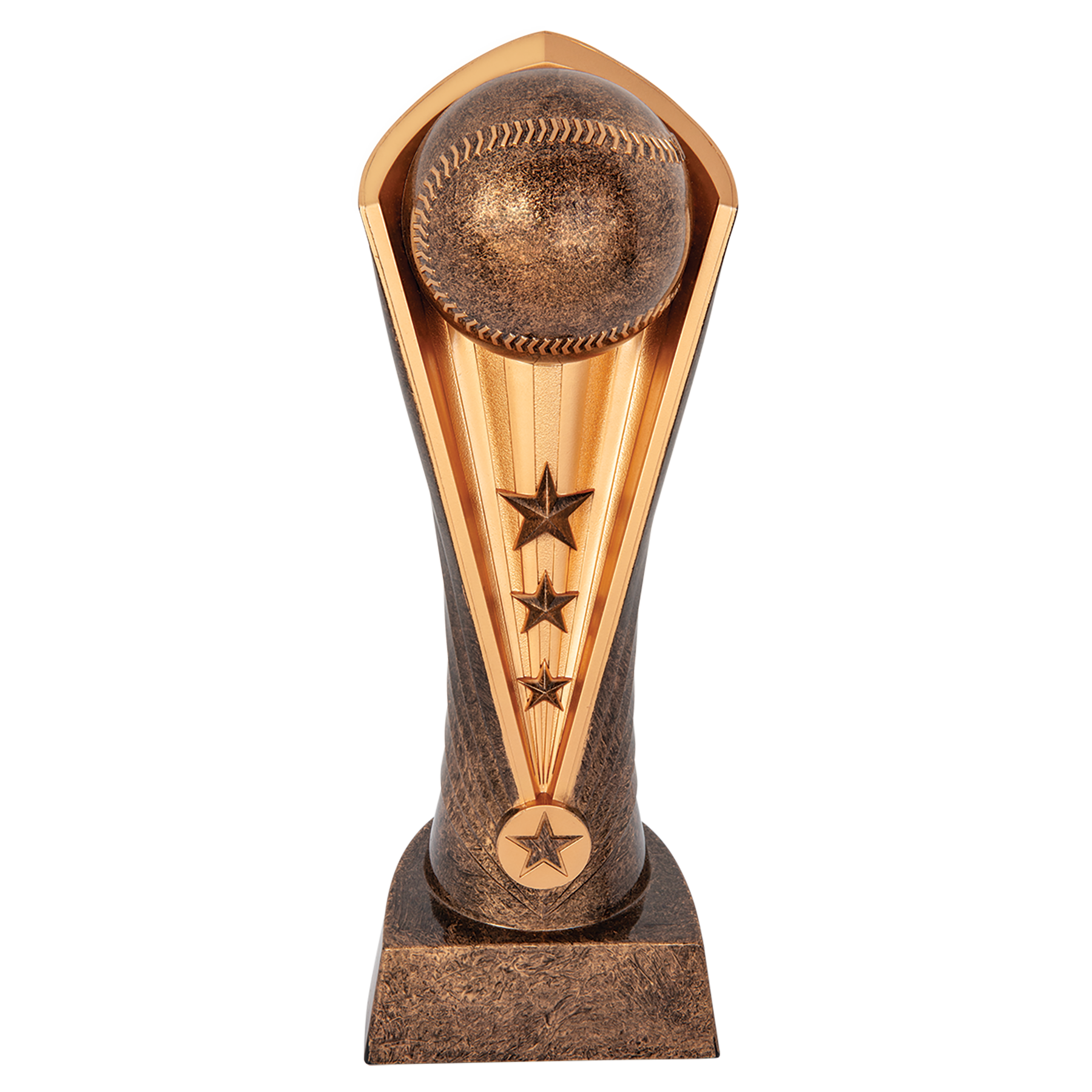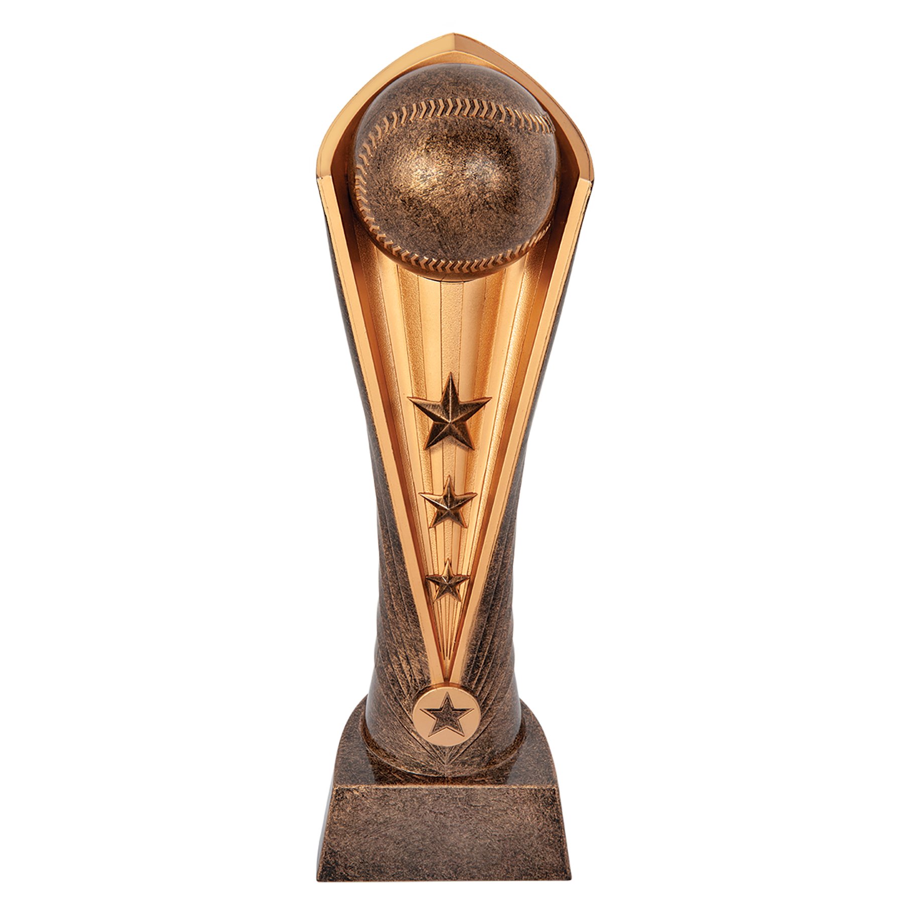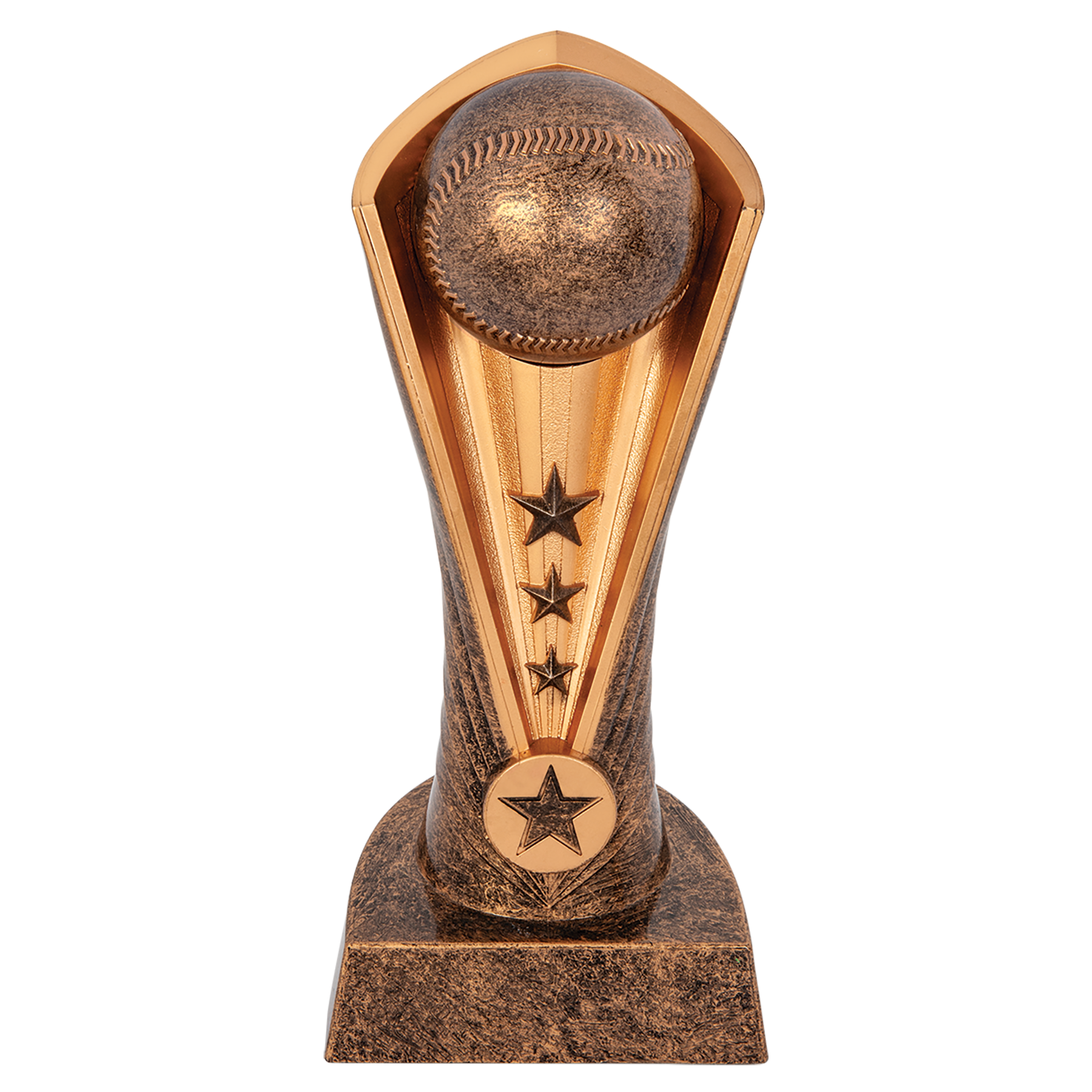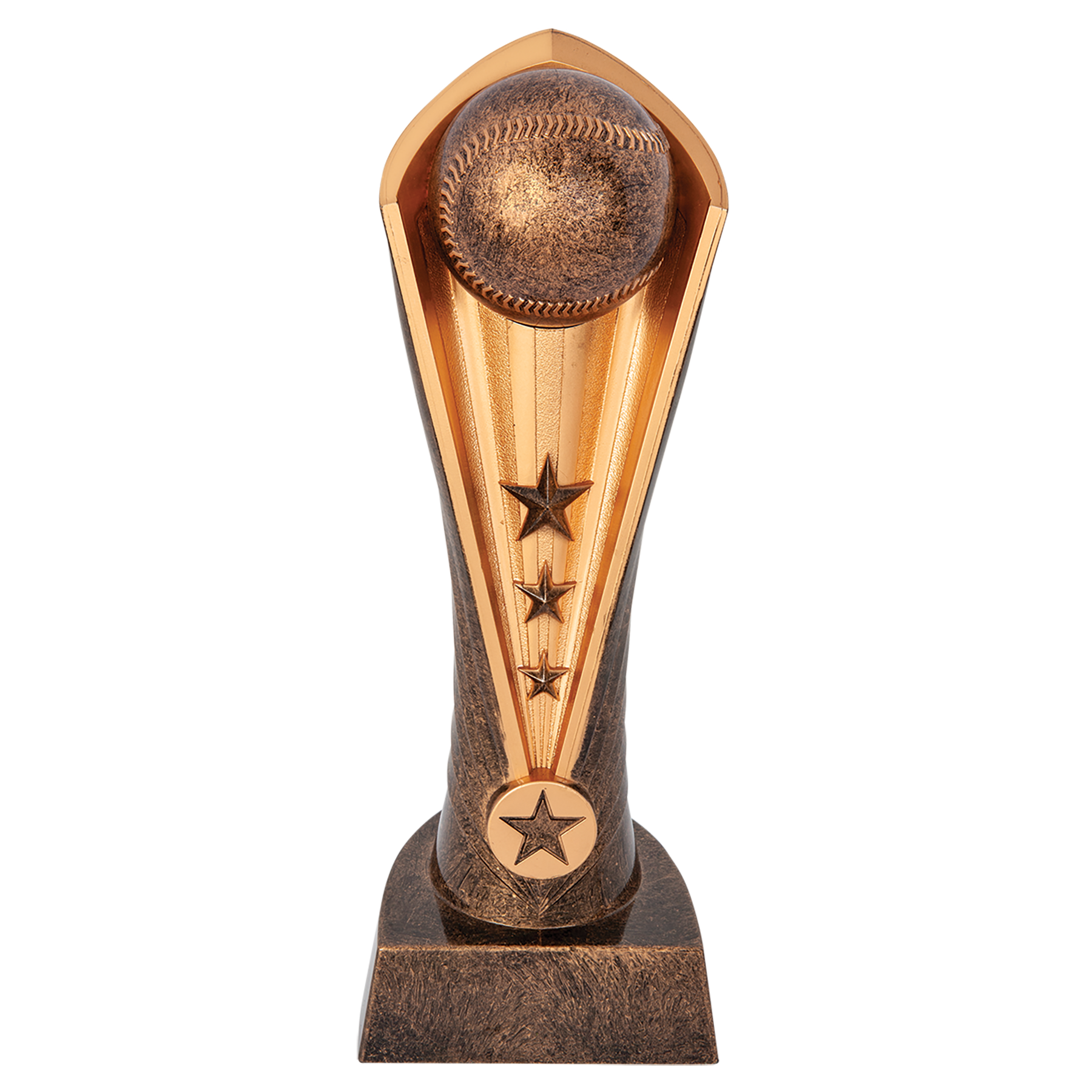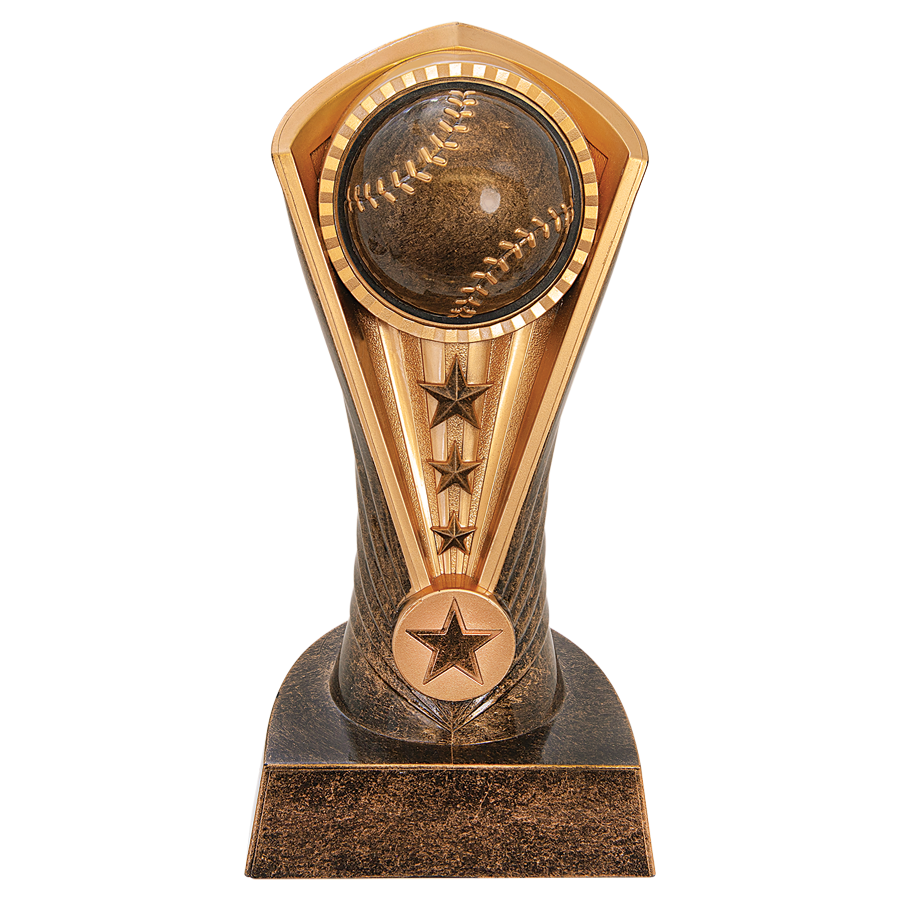 The Cobra Award is made of weighted Plastic. The gold/antiquegold award has a rounded back with the "hood" detail around the ball. Just add a plate to this award and it's ready to go! All weighted plastic awards are individually boxed.