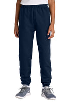 Comfortable and durable youth sweatpants made with pill-resistant NuBlend® fleece. Features a covered elastic waistband and elastic cuffs for a secure fit, perfect for active kids. Designed without a drawcord for enhanced safety and a smooth surface for custom printing.