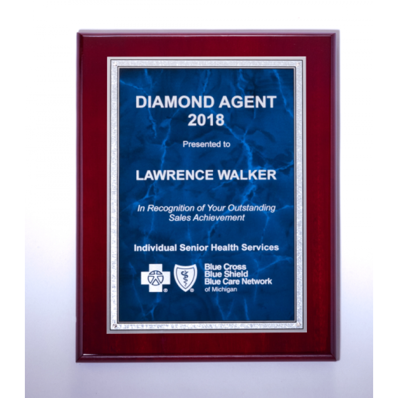 Placa de palisandro de alto brillo complementada con una impresionante placa de mármol azul con borde florentino plateado. Nuestras placas de alto brillo representan una excelente relación calidad-precio. Placa de aluminio grabable con láser. En cajas individuales.