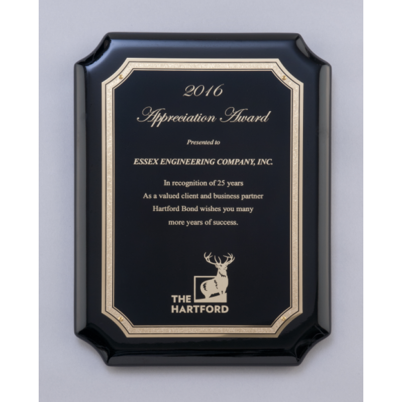 High gloss black stained plaque with gold florentine border plate . Laser engravable plate. Individually boxed. LaserFX plate is brass-plated steel, we recommend laser engraving only.