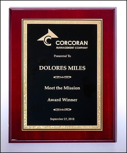 High gloss rosewood plaque complemented by an elegant black plate with gold flroentine border. Our high lustr plaques represent great value for the money. Laser engravable aluminum plate. Individually boxed.