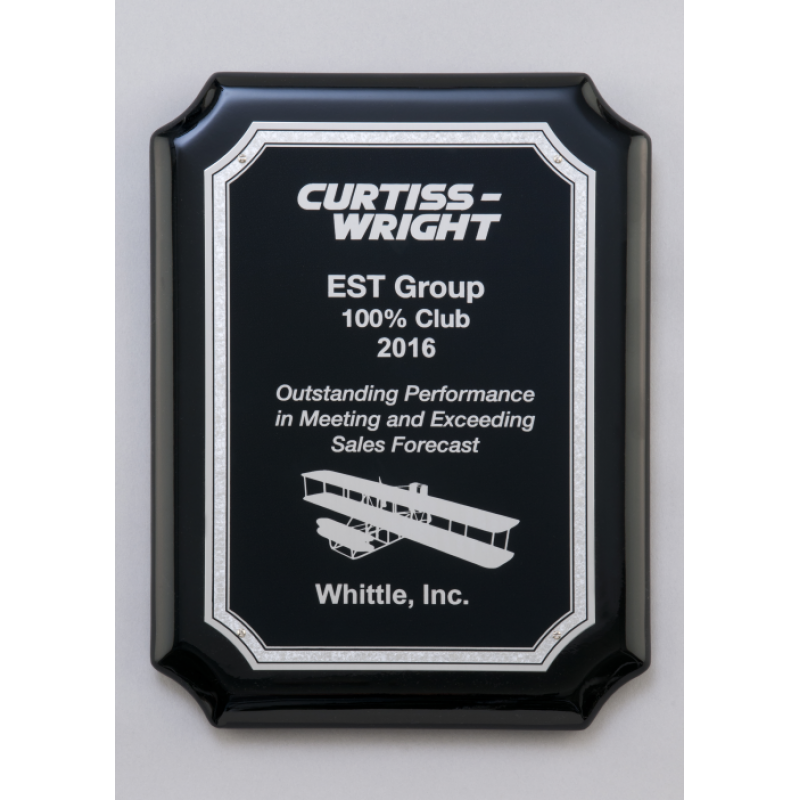 High gloss black stained plaque with silver florentine border plate . Laser engravable aluminum plate. Individually boxed..