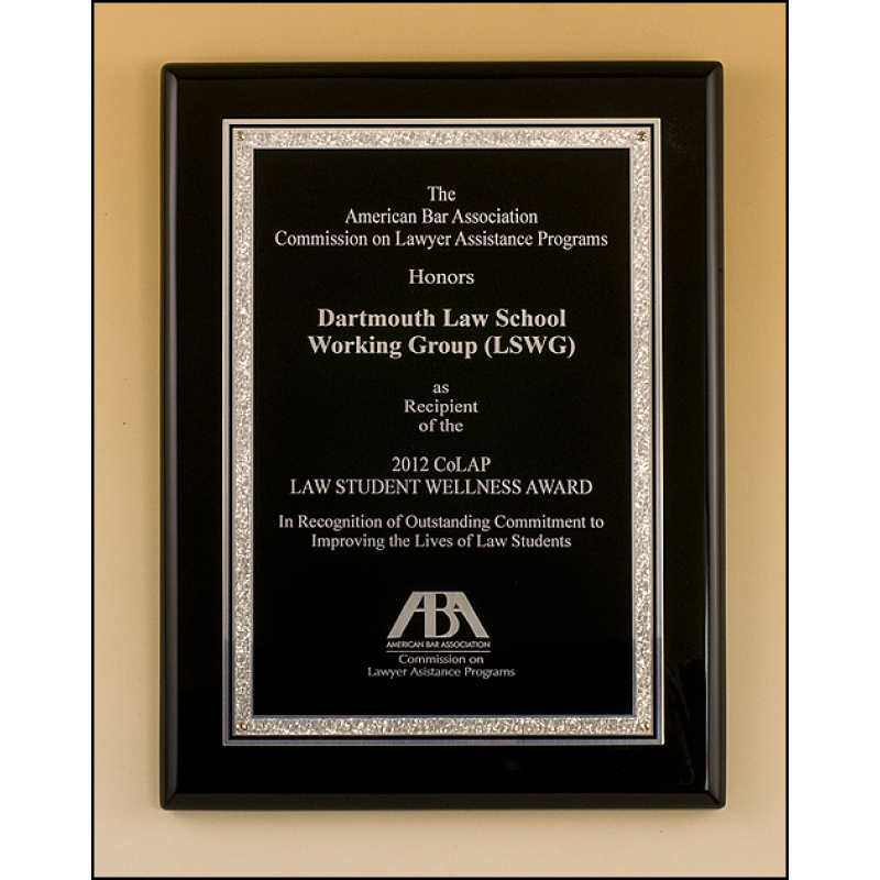 Silver florentine border with textured black center on black piano-finish plaque. Laser engravable aluminum plate. Individually boxed.