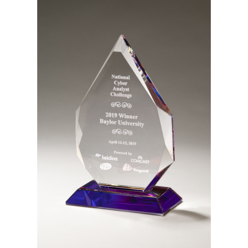 Diamond Series crystal award with prism-effect base. Our special prism-effect coating sends a rainbow of light through the polished edges of this special award. Produced from the highest quality lead-free optical crystal this flame award will show the recipient how important they are to your organization. All crystal awards are suitable for laser engraving or sand etching. Packaged in padded, satin-lined gift boxes.