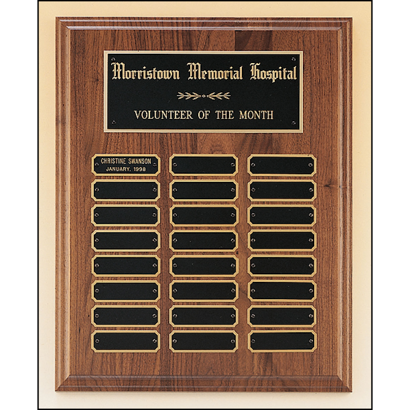 Black piano-finish perpetual plaque. Laser engravable brass plates. 12 or 24 individual plates. Individual plates are 7/8” x 2-3/4”. Individually boxed.