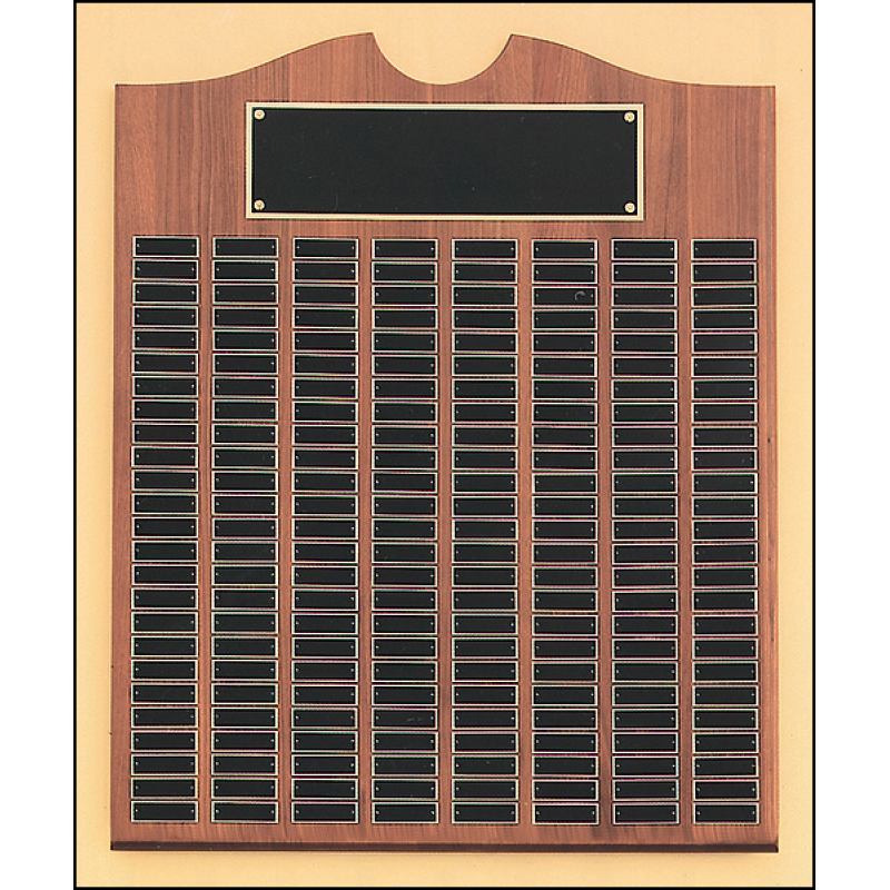 America's most popular line of perpetual plaques, appropriate for donor and alumni walls. Solid American walnut plaque with traditional scalloped design top. A wide choice of plate combinations to suit almost any purpose. Black brass plate(s). Individual plates are 7/8" x 2-3/4". Made in USA.